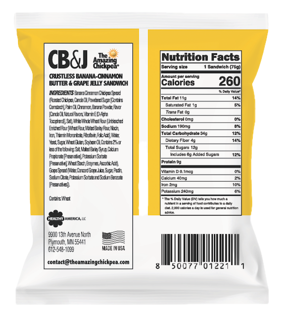 Meet your students’ next favorite menu item: the Crustless CB&J™ Sandwich, our nut-free twist on the classic—crafted specifically for K-12 schools. Made with The Amazing Chickpea® Spread and real fruit jelly with 50% reduced sugar, this soft, crustless sandwich is individually packaged, frozen, and ready to serve in minutes.